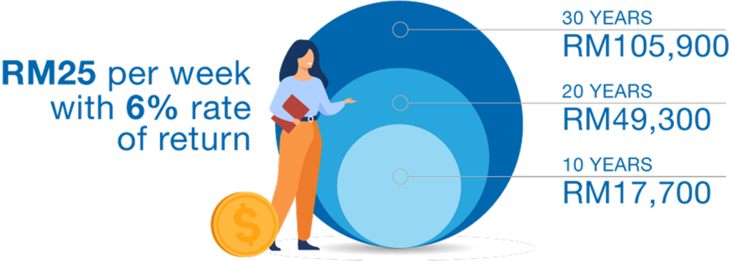 With compounding, even small amounts can add up over time. For instance, if you put RM25 a week in a jar for 30 years, you’d get RM39,000. But if you invest it instead, here’s how much it can potentially grow.
