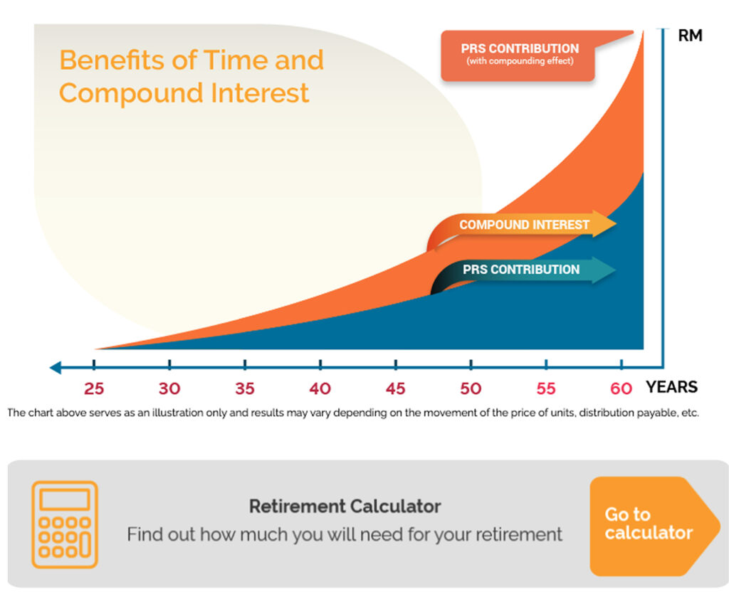 PRS is a long-term savings and investment scheme designed for your retirement. When it comes to your retirement savings, the element of compounding is a powerful tool as it essentially means interest or earnings are added to your contributions over your period of investing until retirement. Give your PRS contributions time to grow and tap on the power of compounding on your contribution amount.